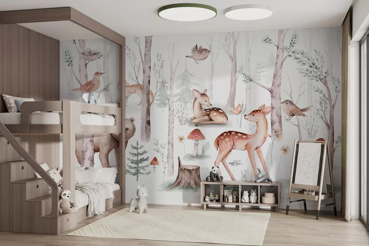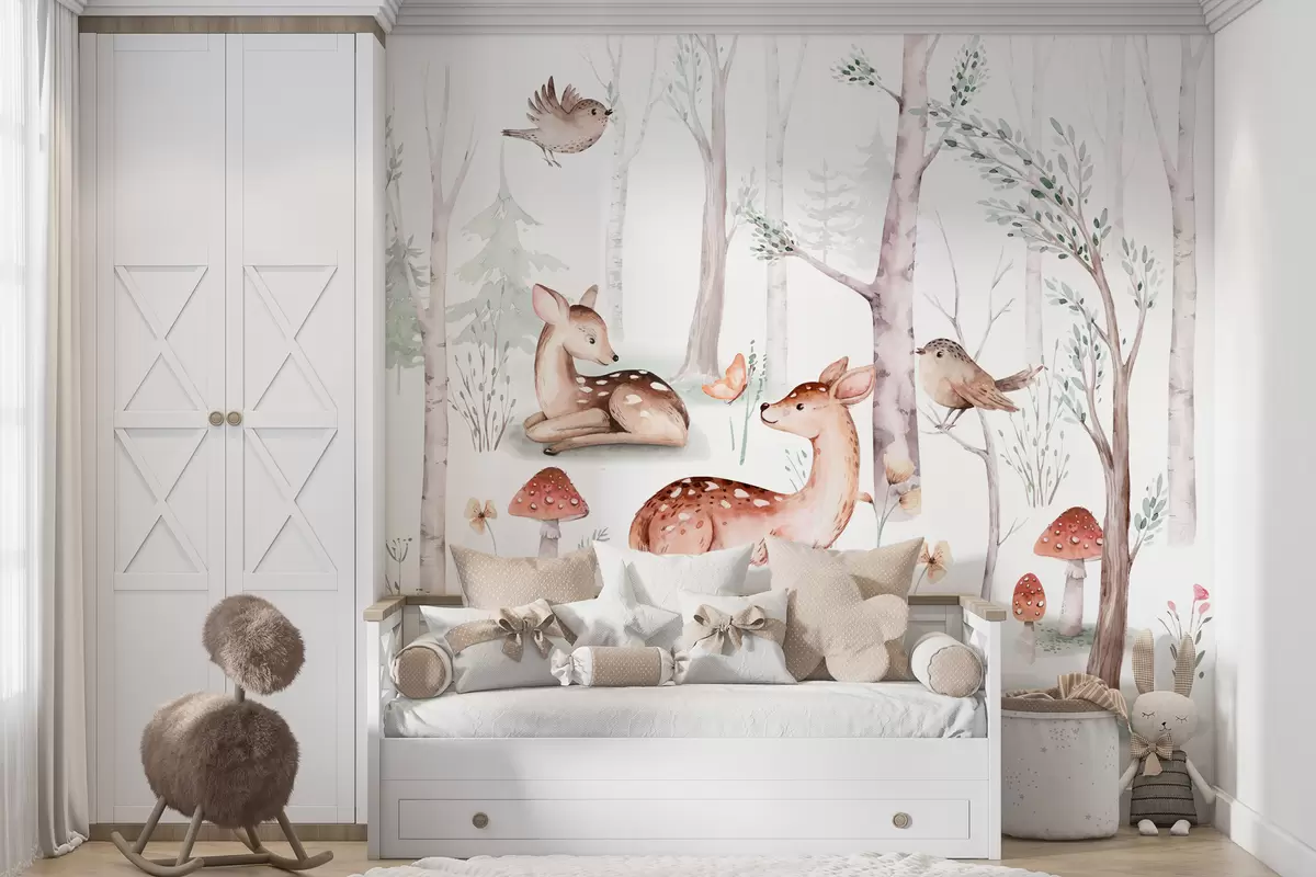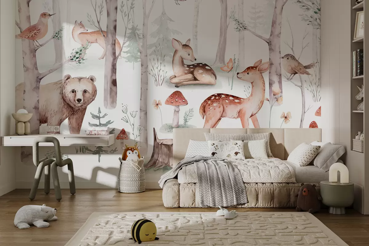 Fotomurales Papel pintado para la habitación de los niños, animales del bosque. Delicado papel pintado de estilo acuarela en agradables colores pastel cálidos sobre fondo blanco Nr. w01089
