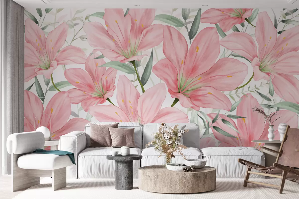 Fotomurales Grandes lirios rosa pálido y hojas en estilo acuarela sobre fondo blanco Nr. w01121