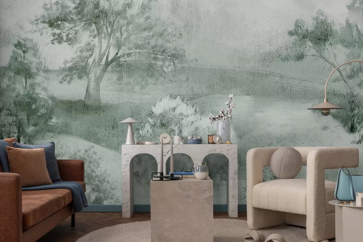 Fotomurales Pintura de paisaje de una escena rural brumosa rodeada de frondosos árboles y follaje en tonos azules. Nr. w01247v2