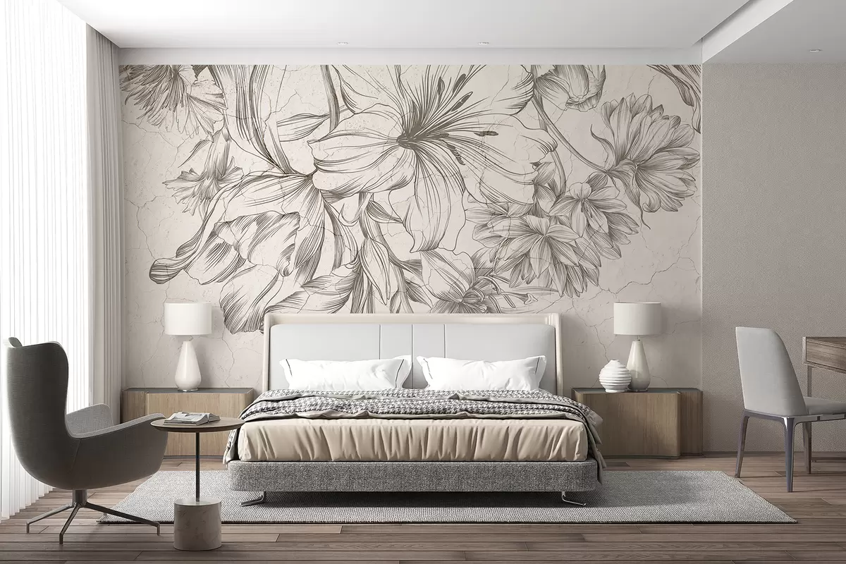 Fotomurales Un boceto en blanco y negro de una impresión gráfica de flores grandes. Nr. w01253