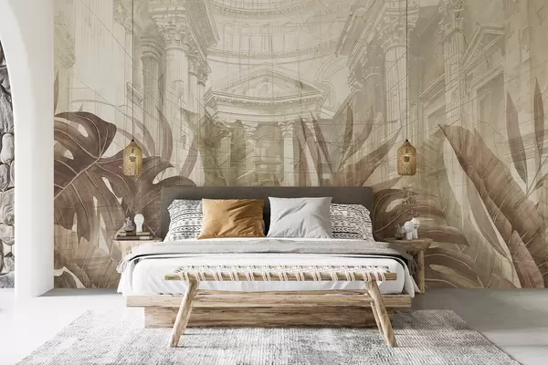 Fotomurales Un gran dibujo arquitectónico adornado con columnas de mármol y exuberantes plantas tropicales de color sepia. Nr. w01311v1