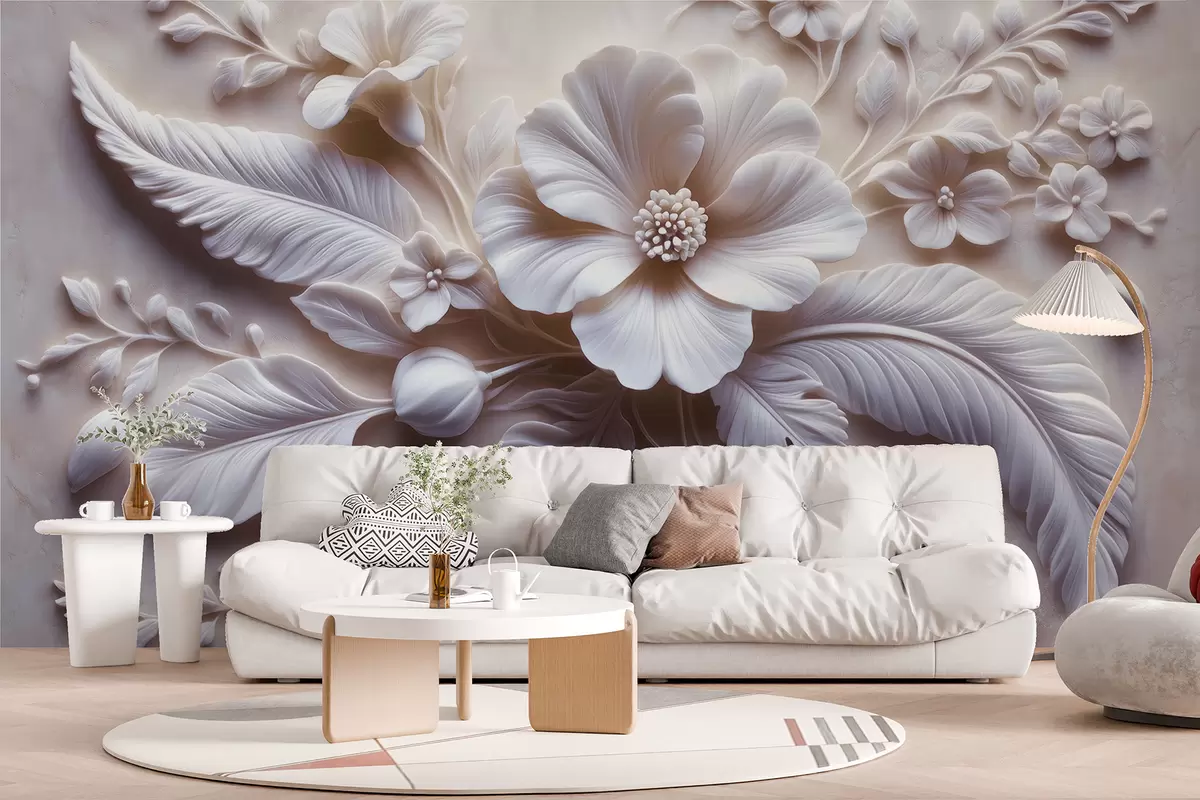 Fotomurales Arte de pared en relieve 3D con plumas y flores, con una gran amapola en colores rosa claro Nr. w01340v1