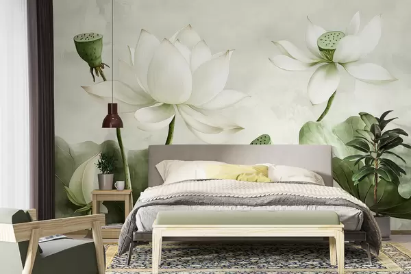 Fotomurales Flores de loto, acuarela, naturaleza, composición floral, hojas grandes, colores verdes suaves Nr. w01445v2