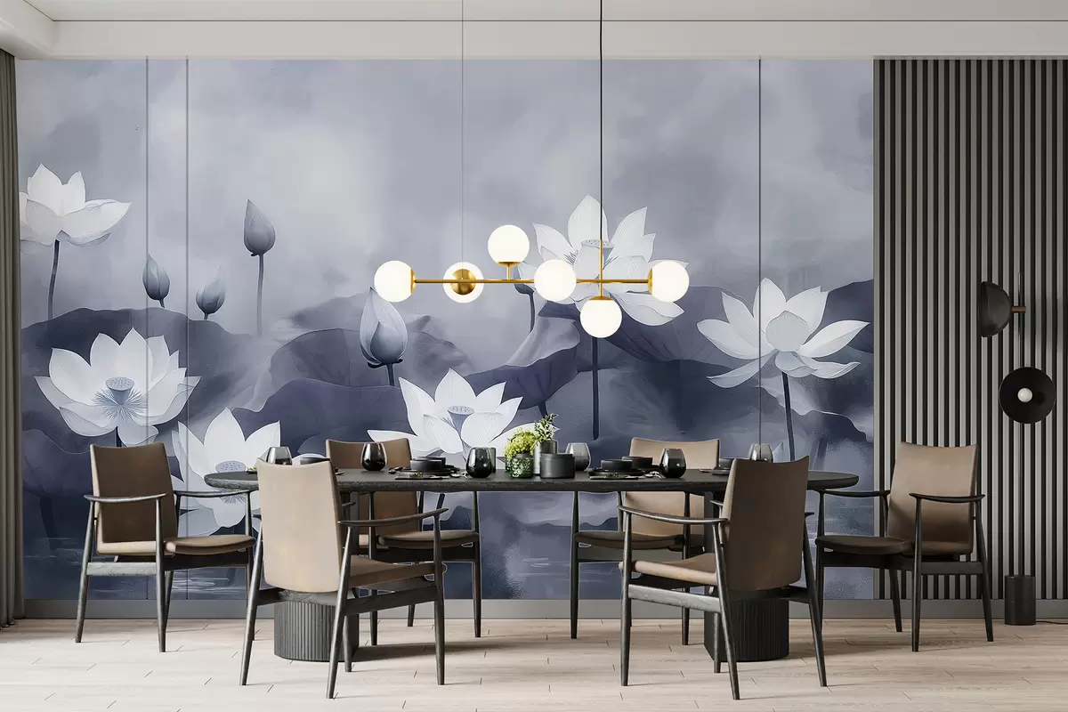 Fotomurales Lotos en el lago, naturaleza, niebla, dibujo acrílico, hojas grandes, jungla, colores grises suaves Nr. w01450v1