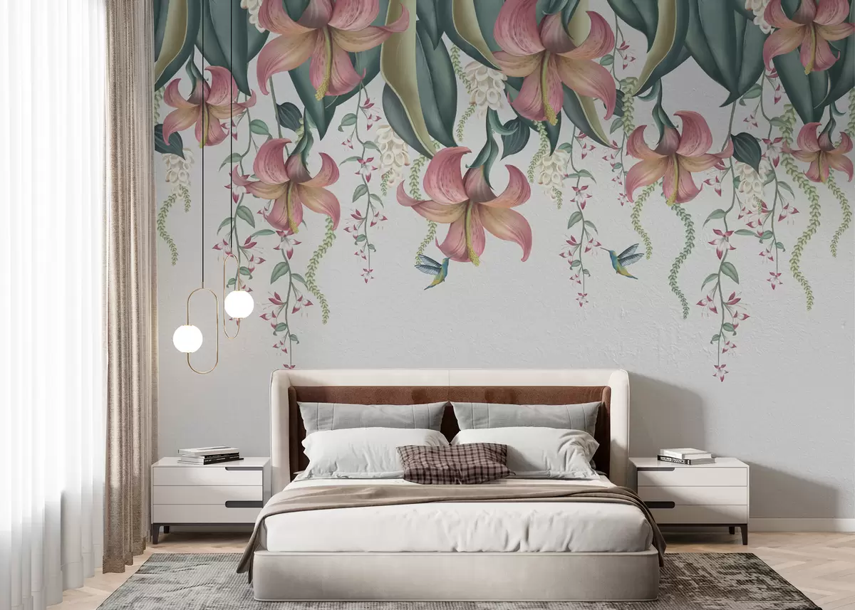 Fotomurales Delicado motivo botánico con lirios colgantes, flores y colibríes en una pared clara Nr. w01523v1