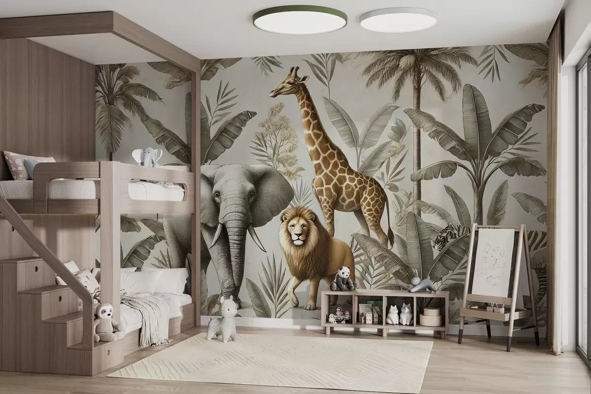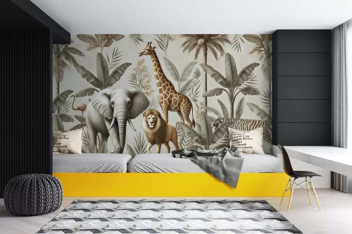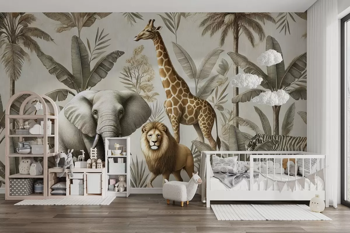 Fotomurales Papel pintado infantil Safari con paisaje tropical y varios animales en elegantes colores Nr. w01956