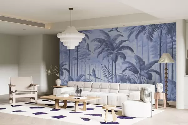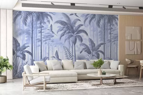 Fotomurales Panorama con paisaje tropical y aves en tonos azules Nr. w01957v1