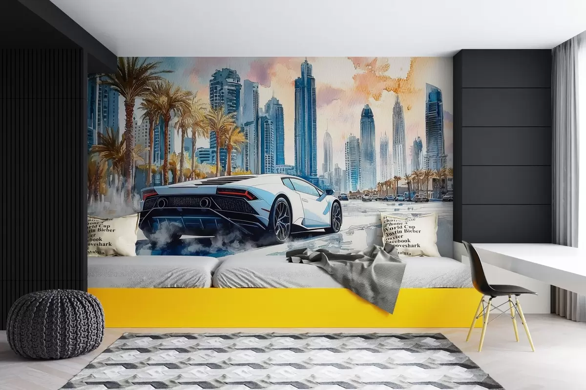 Fotomurales Un moderno coche deportivo blanco corriendo sobre un fondo de palmeras y rascacielos en técnica de acuarela libre Nr. w01963