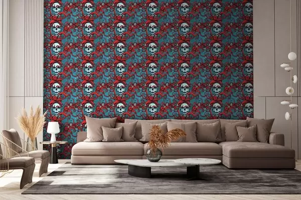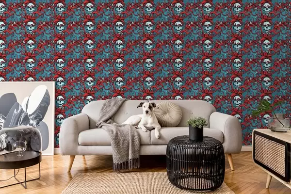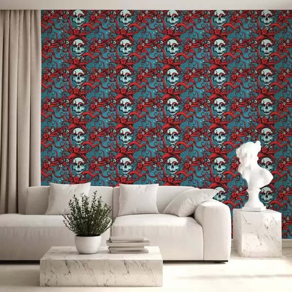 Fotomurales Motivo místico con calaveras y tentáculos rojos de pulpo sobre fondo turquesa Nr. w02123