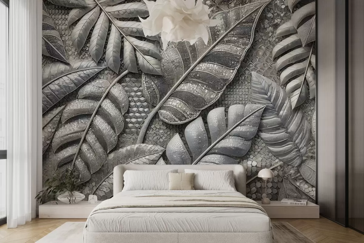 Fotomurales Grandes hojas tropicales en delicados tonos plateados, en estilo mosaico texturizado Nr. w02135