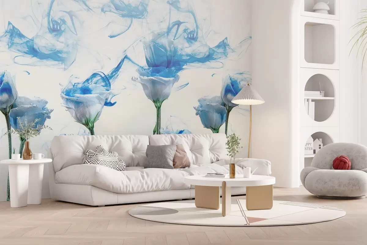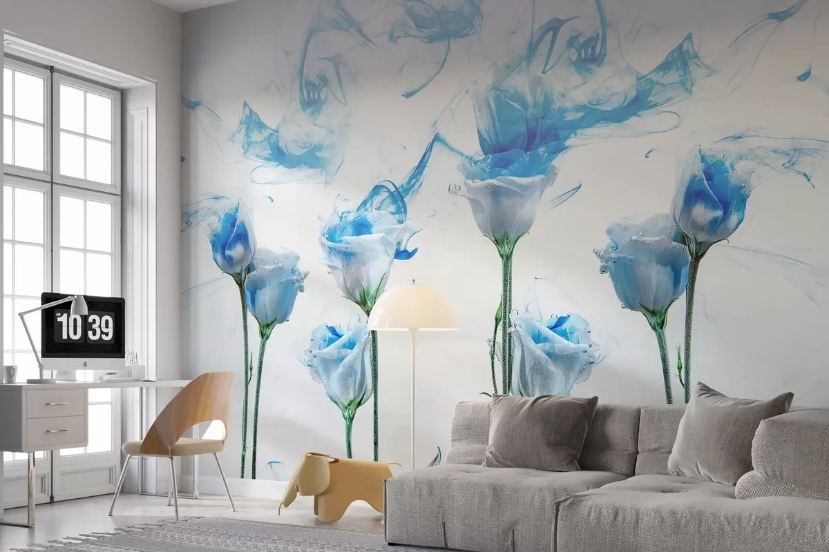 Fotomurales Rosas blancas bajo el agua sobre fondo blanco con vetas de pintura acrílica azul. Nr. w02139