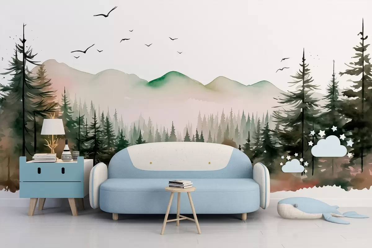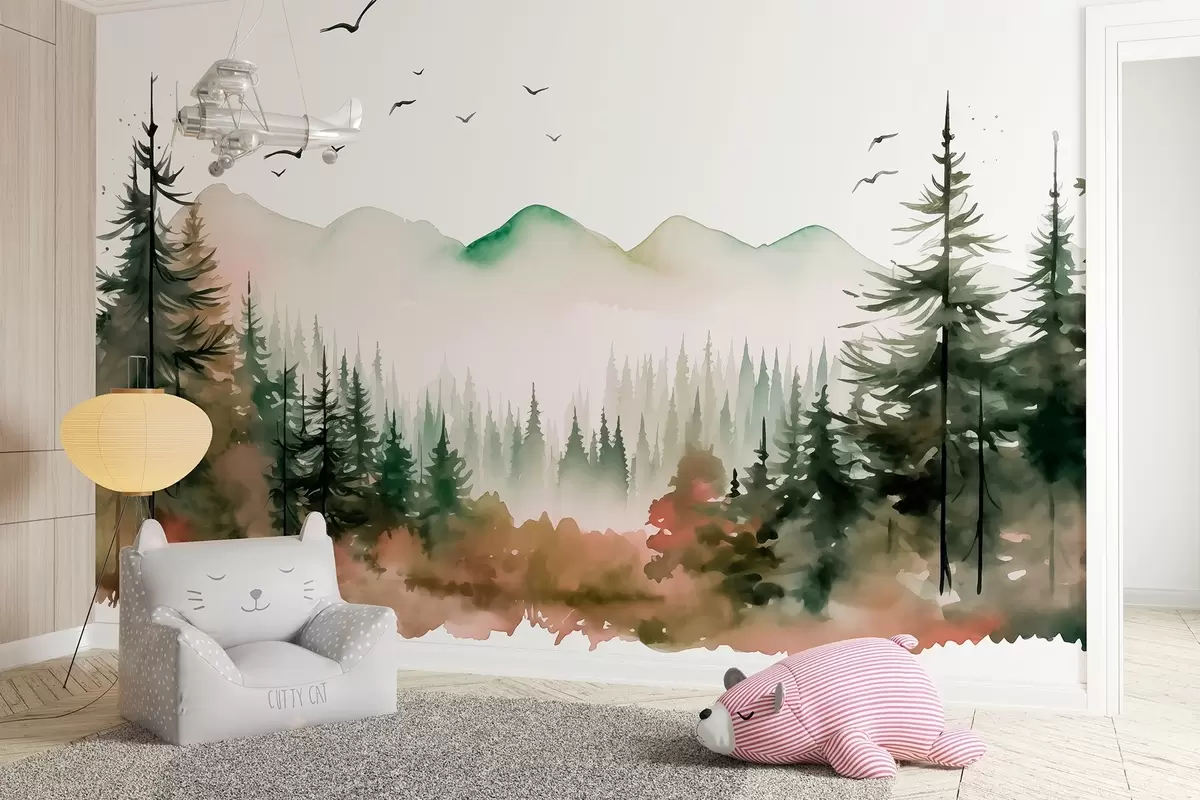 Fotomurales Paisajes de bosque y montaña en acuarela, colores verde y rosa Nr. w02150v1