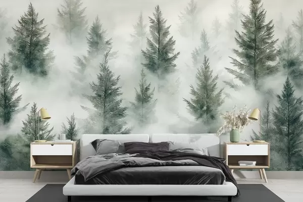 Fotomurales Hermoso bosque con pinos, niebla, paisajes de naturaleza, colores verdes Nr. w02222