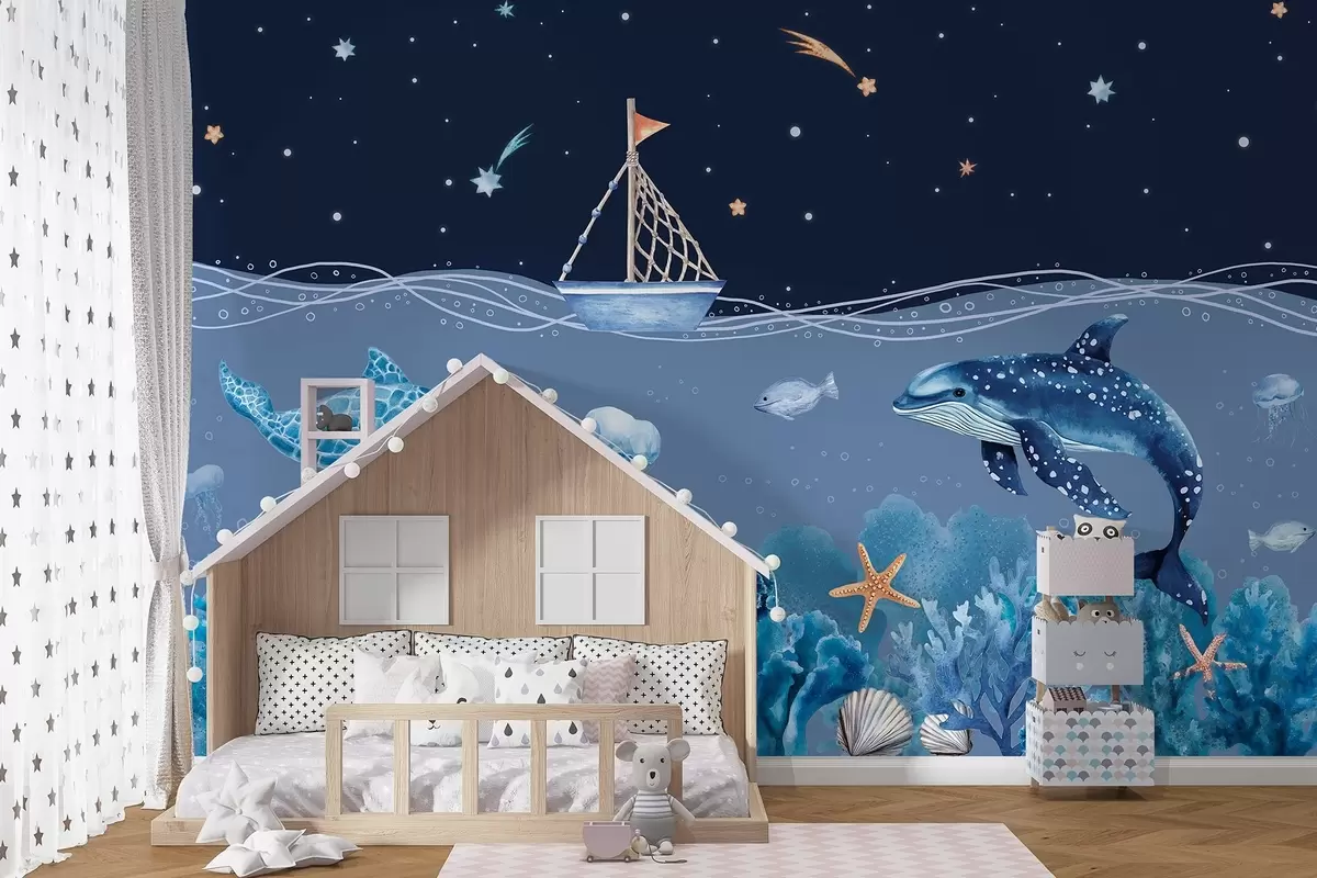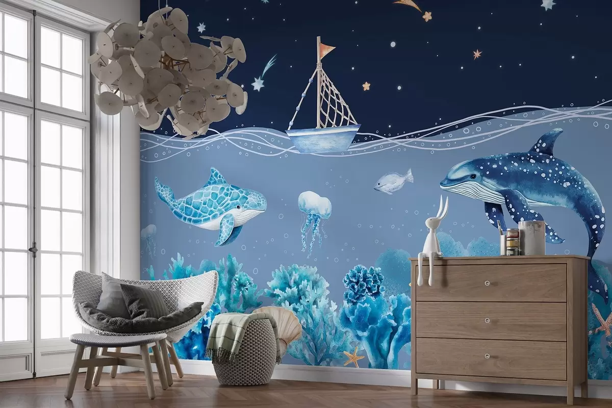 Fotomurales Vida marina, estilo acuarela, corales, barco, delfín, medusa, cielo nocturno estrellado, colores azules Nr. w02310