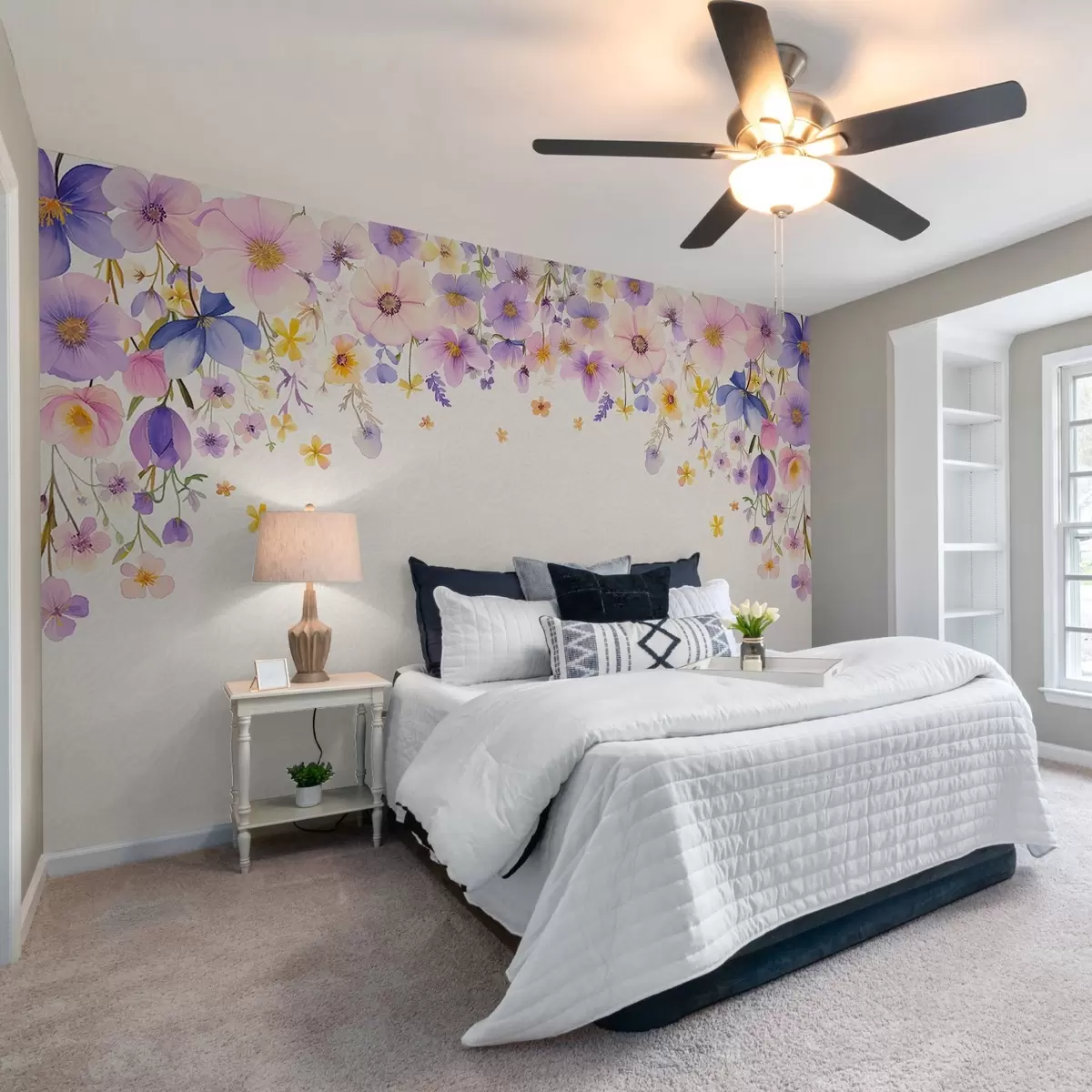 Fotomurales Delicado arreglo floral con flores de acuarela en suaves tonos pastel de rosa, morado y amarillo. Las flores caen suavemente en cascada desde arriba, dejando un ligero fondo estampado debajo. Nr. w02345