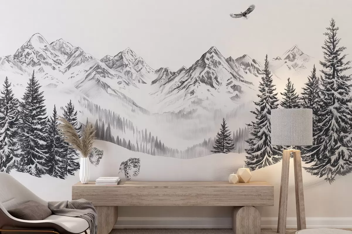 Fotomurales Montañas invernales, leopardos de las nieves, bosque de pinos, dibujo a lápiz, águila volando Nr. w02360