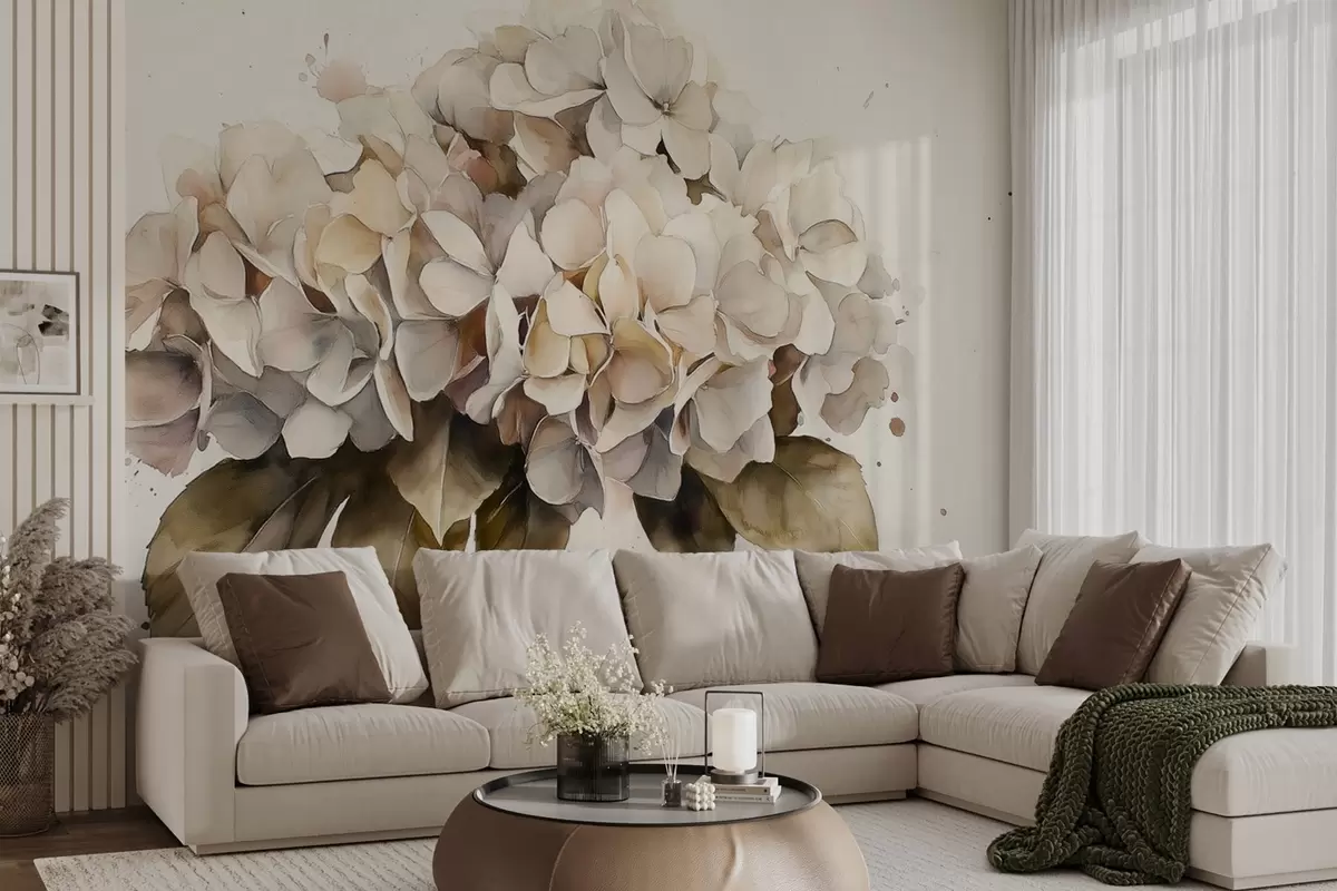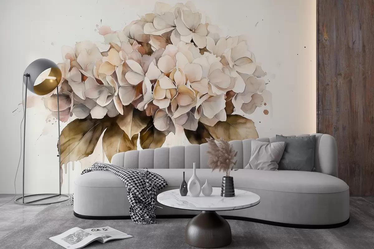 Fotomurales Dibujo estilo acuarela de flor de hortensia, colores beige Nr. w02485