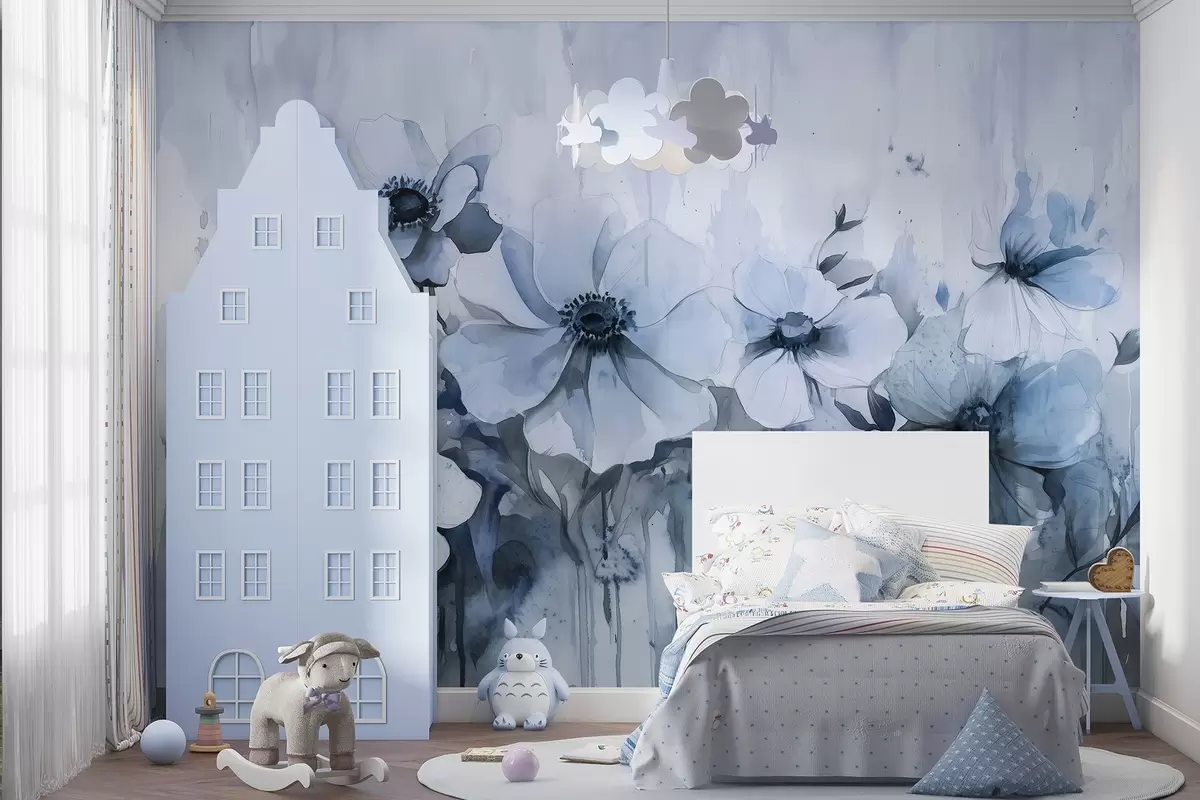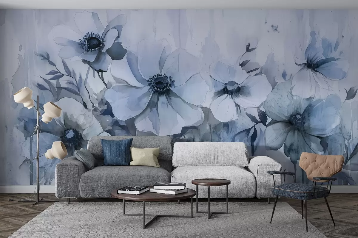 Fotomurales Flores rústicas, dibujo estilo acuarela, colores azules Nr. w02487v1
