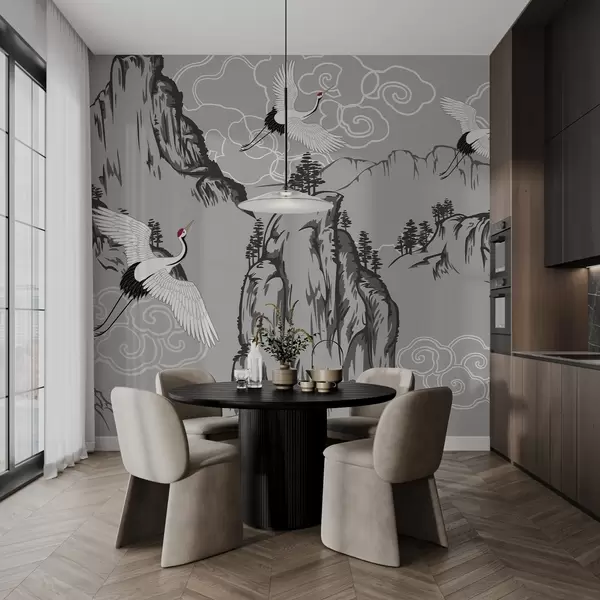 Fotomurales Montañas y grullas de estilo japonés, en tonos grises Nr. w02544v1