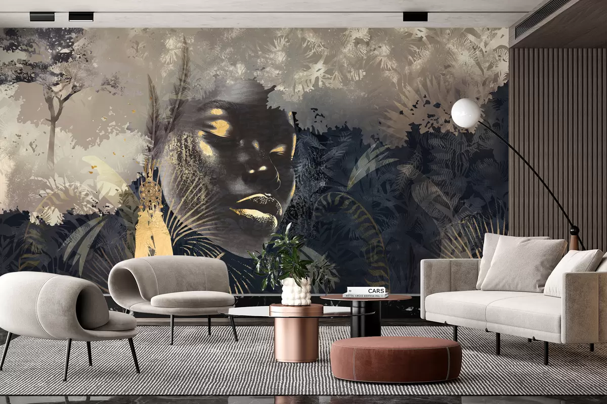 Fotomurales África mágica con selva tropical, elementos femeninos y vectoriales con tinte azul Nr. w02642v1