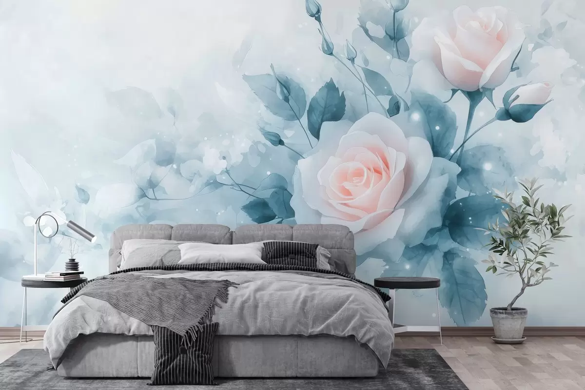 Fotomurales Delicadas rosas melocotón en tonos turquesa en estilo acuarela Nr. w02871