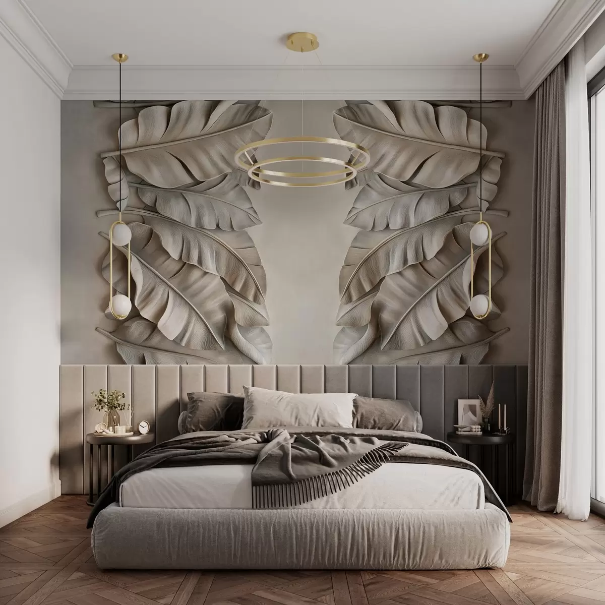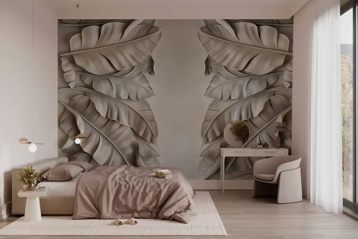 Fotomurales imitación de un bajorrelieve con hojas tropicales en tonos beige Nr. w03285