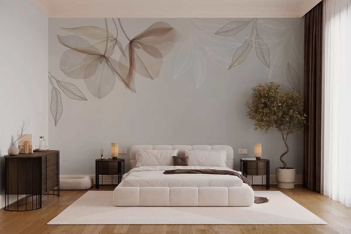 Fotomurales delicadas flores y hojas translúcidas en tonos moca Nr. w03616v3