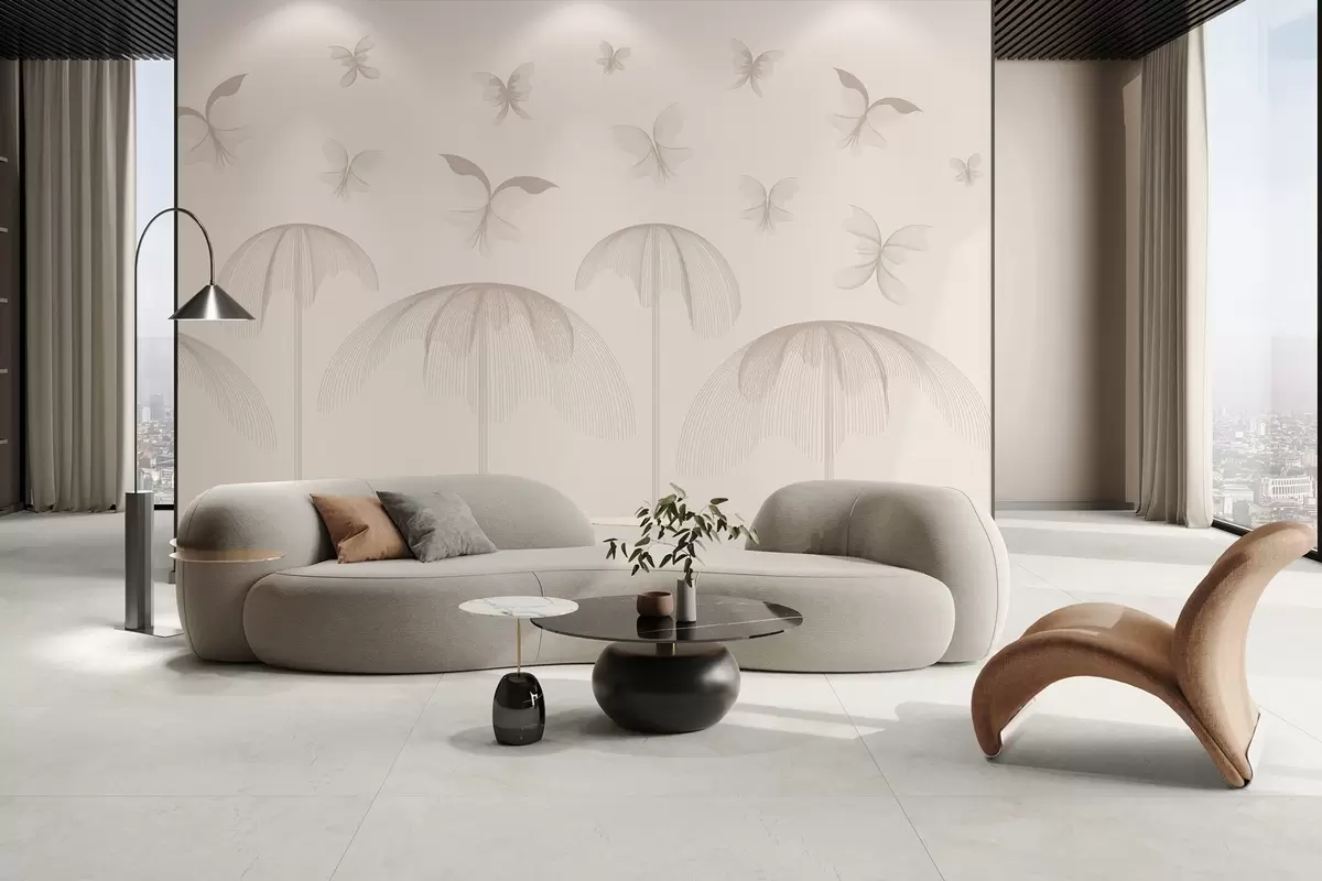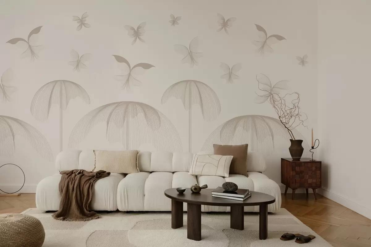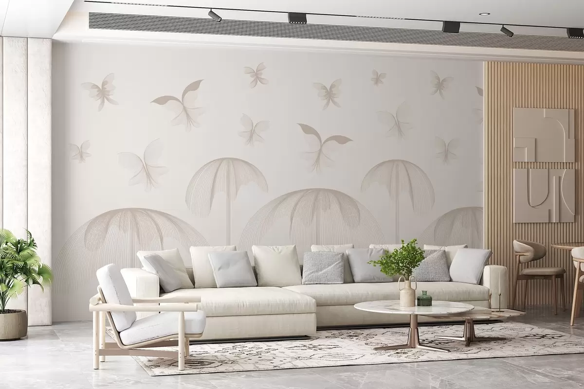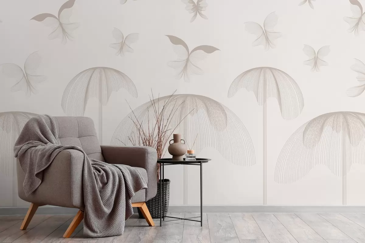 Fotomurales papel pintado minimalista lineal mariposas y fuentes sobre fondo lechoso Nr. w03762