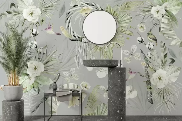 Fotomurales Adorno de estilo boho con flores de peonía y pájaros, estilo acuarela, colores verdes Nr. w03885v2