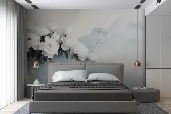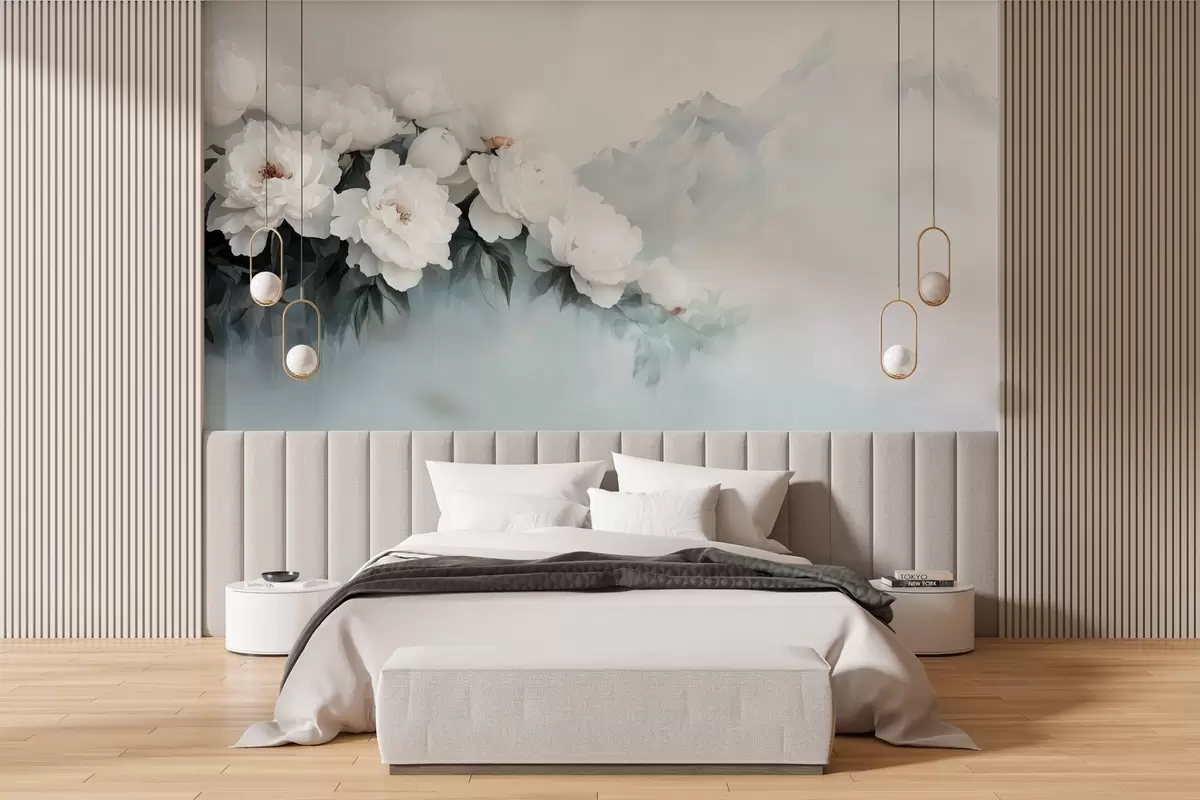 Fotomurales pintorescas y exuberantes peonías blancas con las montañas neblinosas como telón de fondo Nr. w03965