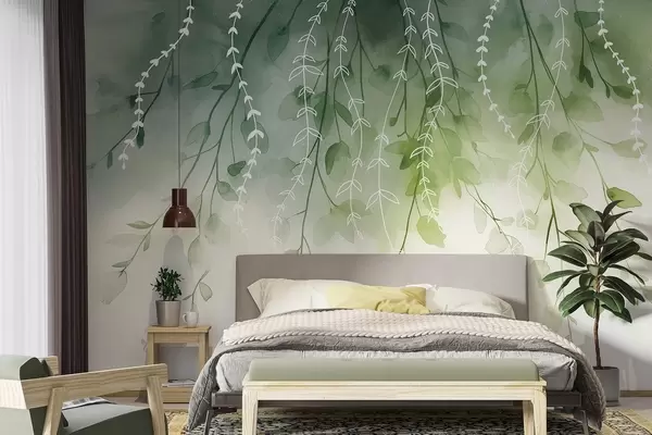 Fotomurales Ramas con hojas en estilo acuarela, colores verdes naturales Nr. w04007