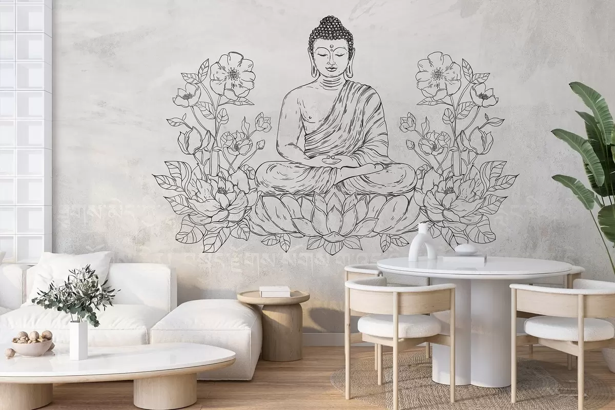 Fotomurales Buda meditando con flores de loto, arte lineal, oriental, fondo beige Nr. w04008v1