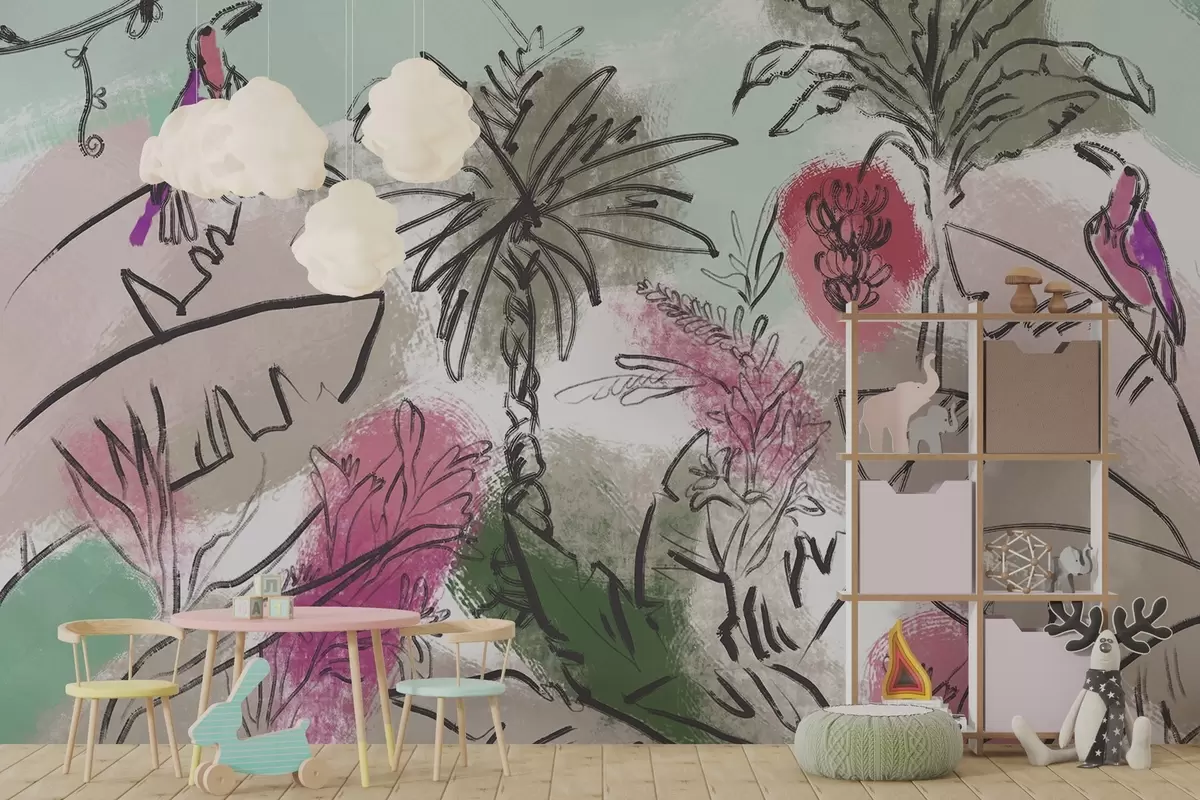 Fotomurales Estampado tropical con flores rosas y loros exóticos Nr. w04019v1
