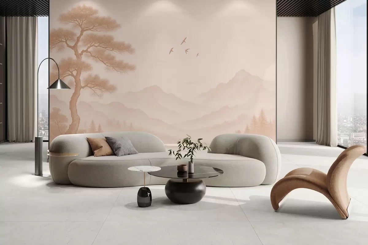 Fotomurales panorama de colinas con un gran árbol en tonos moca Nr. w04033v1
