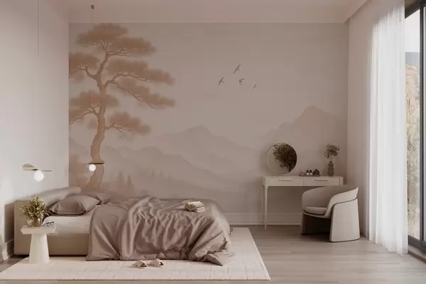 Fotomurales panorama de colinas con un gran árbol en tonos moca Nr. w04033v1