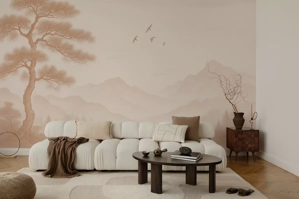 Fotomurales panorama de colinas con un gran árbol en tonos moca Nr. w04033v1