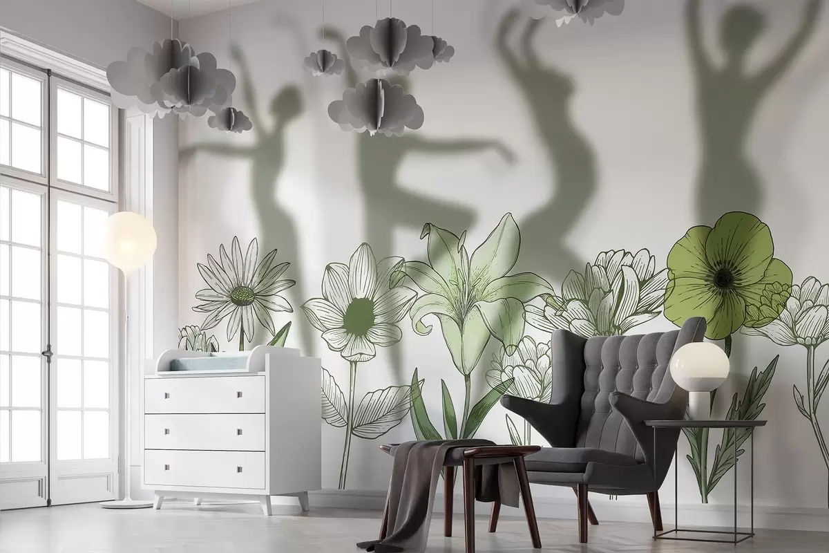 Fotomurales Siluetas de bailarinas, flores rústicas, arte lineal, colores verdes Nr. w04069v1