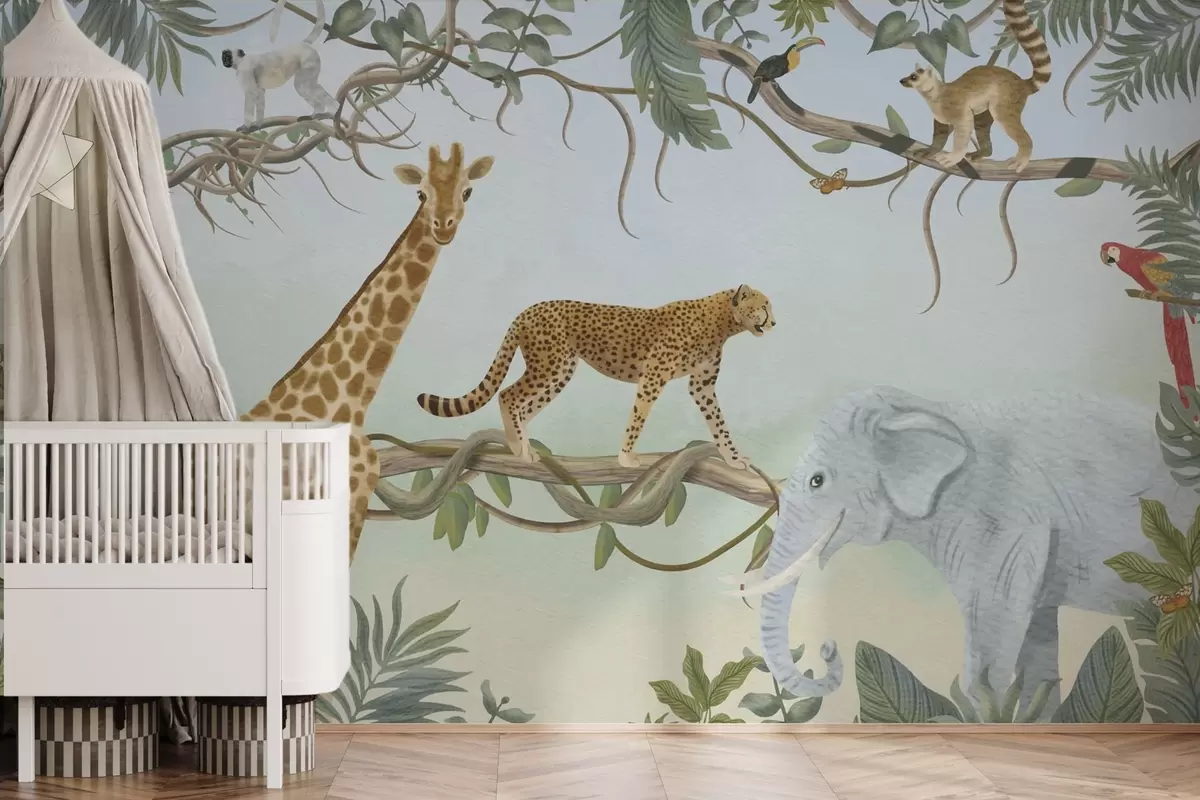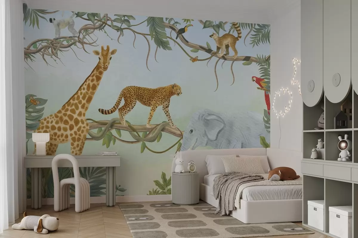 Fotomurales Ilustración de jungla con jirafa, guepardo y elefante Nr. w04194