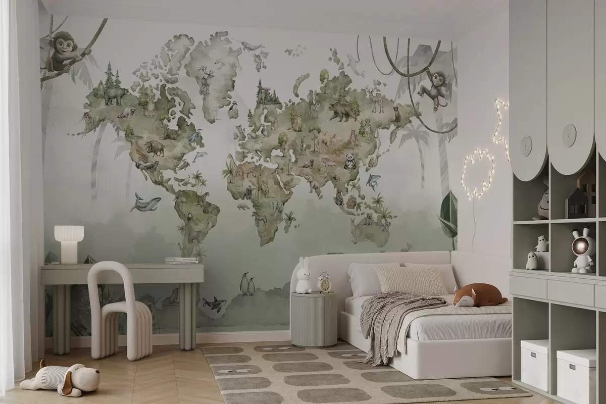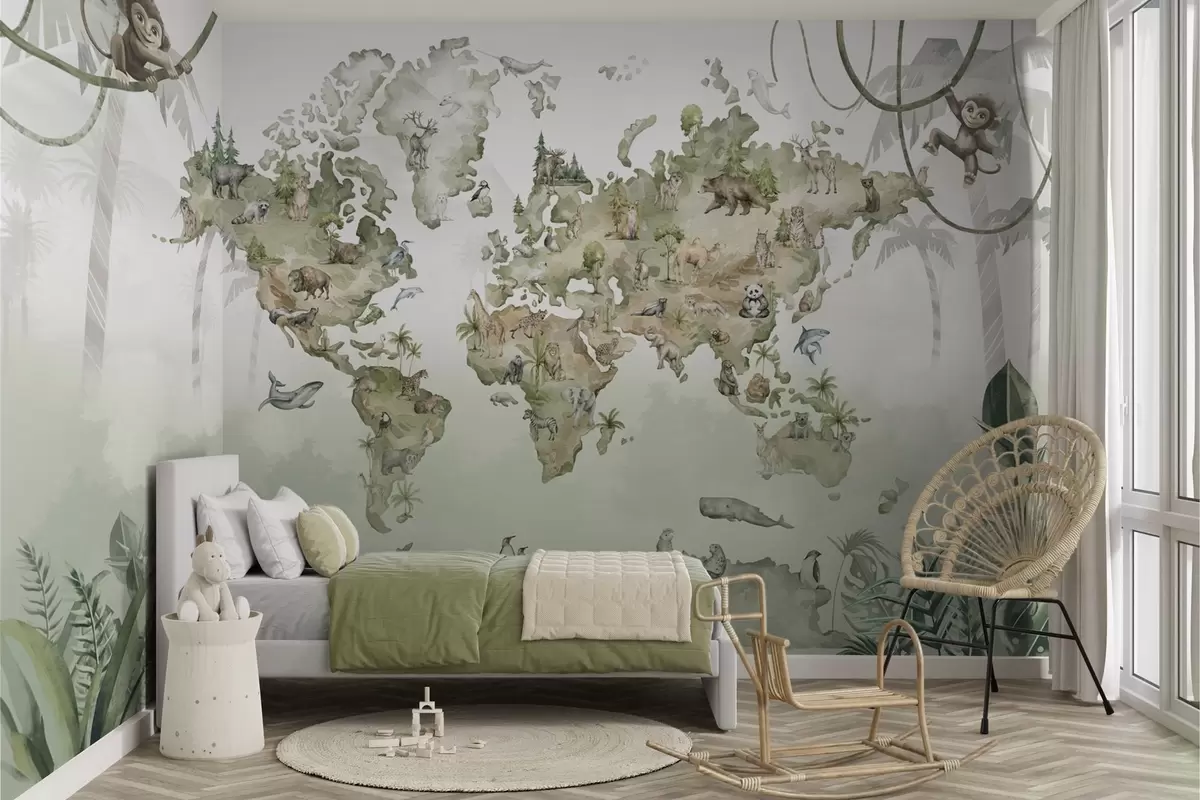 Fotomurales Mapamundi ilustrado con animales y selvas Nr. w04418v1