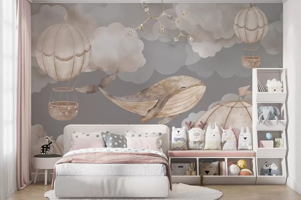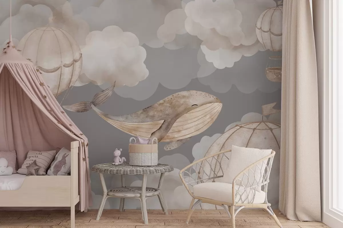 Fotomurales Ballenas y globos aerostáticos entre suaves nubes Nr. w04522