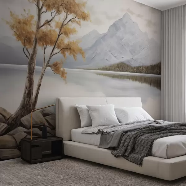 Fotomurales Árbol otoñal junto a un lago de montaña, tranquilos tonos pastel Nr. w04611