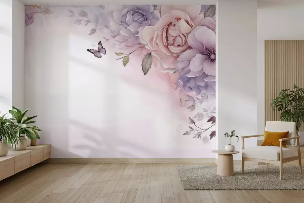 Fotomurales Delicadas flores rosas y lilas con una mariposa Nr. w04711