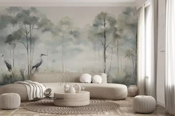 Fotomurales Bosque brumoso junto al agua con garzas, paleta de colores suaves y fríos Nr. w04788