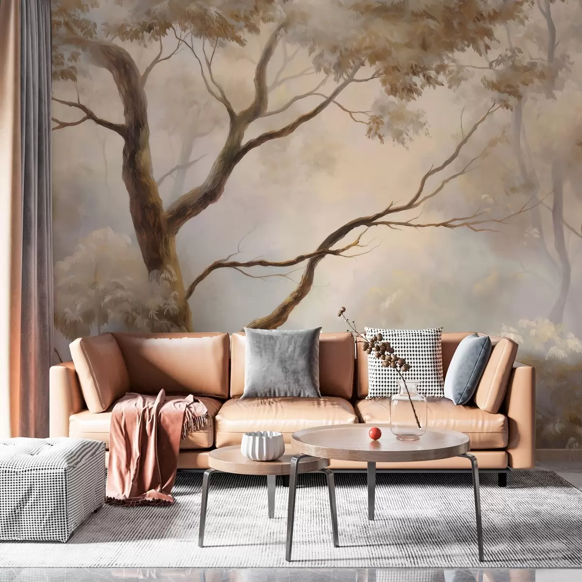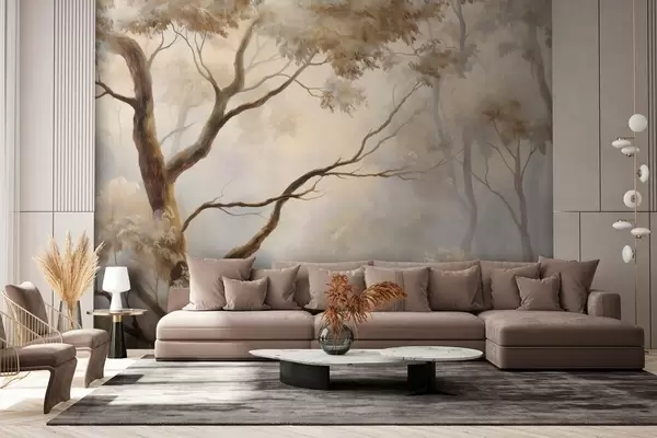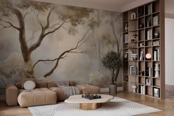 Fotomurales El bosque envuelto en la ligera niebla matinal. Una delicada pintura atmosférica al estilo de un paisaje artístico Nr. w04817
