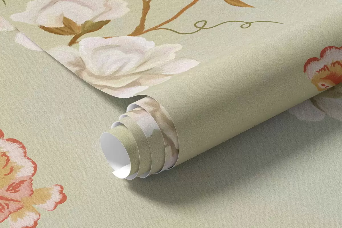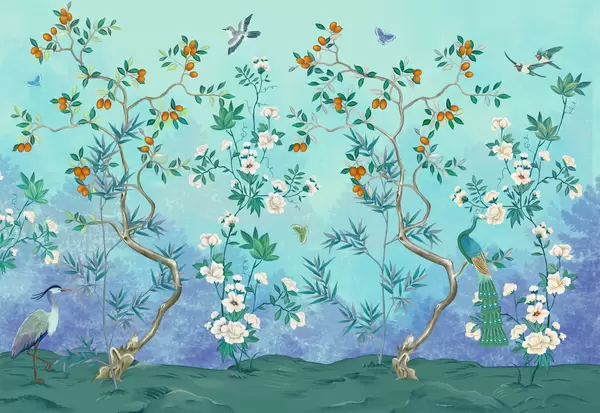 Fotomurales Escena con árboles, flores y pájaros, fondo claro. Nr. w05004v1