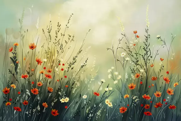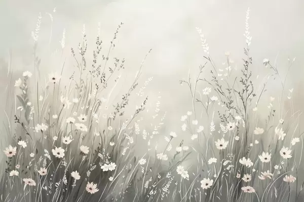 Fotomurales Suave escena de pradera con flores blancas y delicadas hierbas. Nr. w05015v1