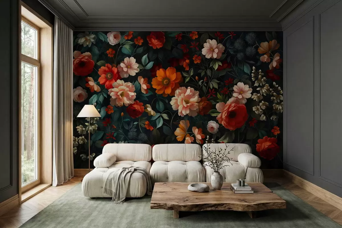 Fotomurales Estampado floral oscuro con exuberantes flores de jardín. Nr. w05087