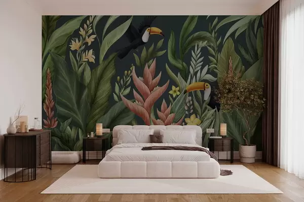 Fotomurales Plantas tropicales y aves de pico grande sobre fondo oscuro Nr. w05088v2