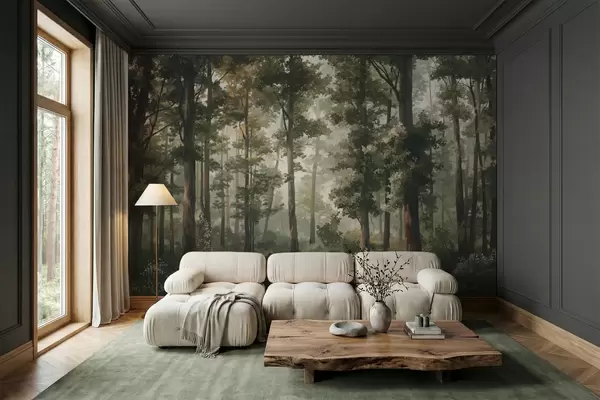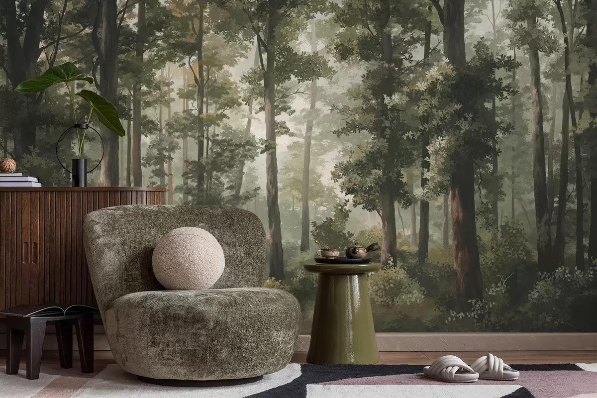 murales de pared Ilustración de un bosque con niebla, árboles altos y un sendero. w05089