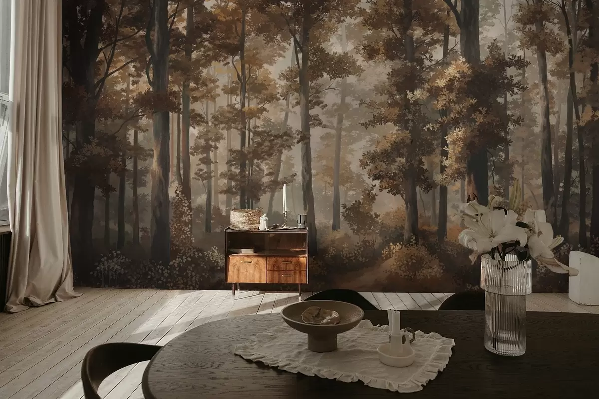 Fotomurales Escena otoñal en el bosque con luz cálida y árboles densos. Nr. w05089v1